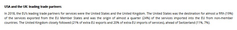 Readers will note that this EU report highlights the USA ahead of the UK. As we have shown above, according to the EU’s own figures it is the United Kingdom which is the biggest market for EU27 services, NOT the USA.