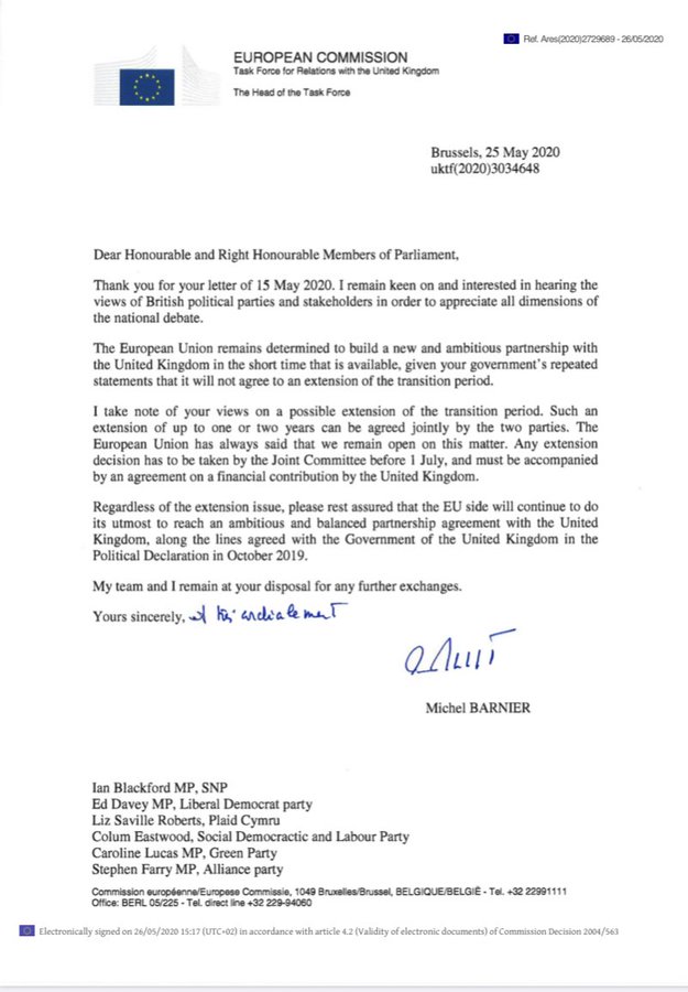 It is more important than ever to keep up full support for the UK’s Chief Negotiator and his team. On Monday Michel Barnier wrote that the EU is “open” to a two year extension to the Transition Period. This means that this is what they want. It also means they want the UK to keep paying for a further two years and to keep being a subservient colony for all that time.