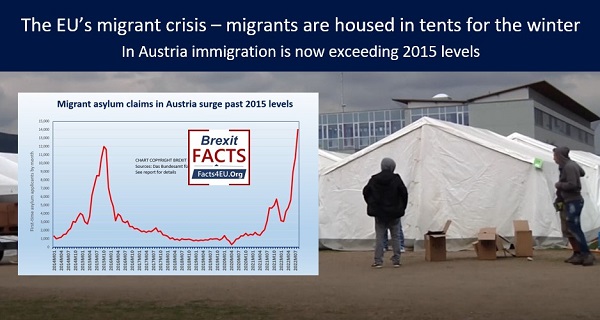 We have previously reported on the huge numbers of migrants now entering the European Union again. The total numbers for the EU27 mask some very important differences between the countries, however. Today we look at just one of these countries, which is now housing migrants in tents.