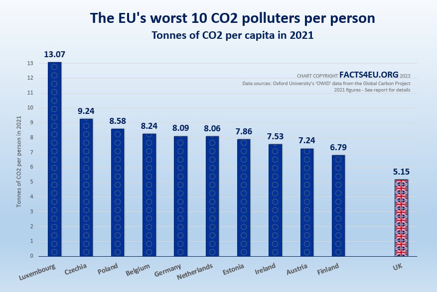 One of the worst offenders is Belgium, home to the EU Commission's 'Green Deal', which belts out 60% more CO2 per person than the UK