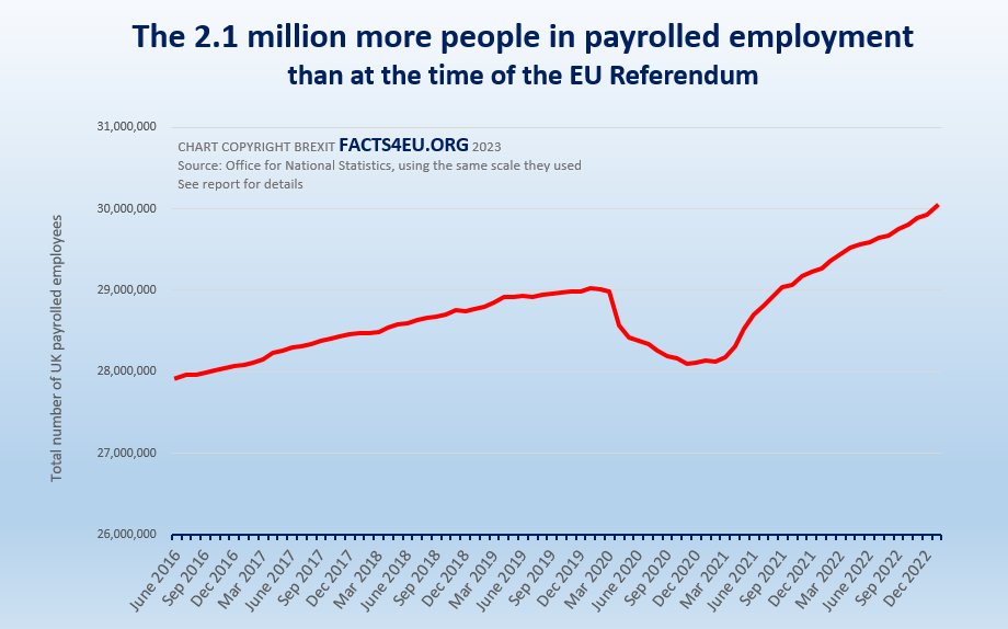 For there to be over two million more people in payrolled employment since the EU Referendum is a magnificent achievement, considering the EU’s hostile and obstructive approach to the UK since the British people voted Leave in 2016. And this is on top of the Covid lockdowns and the Putin energy crisis.