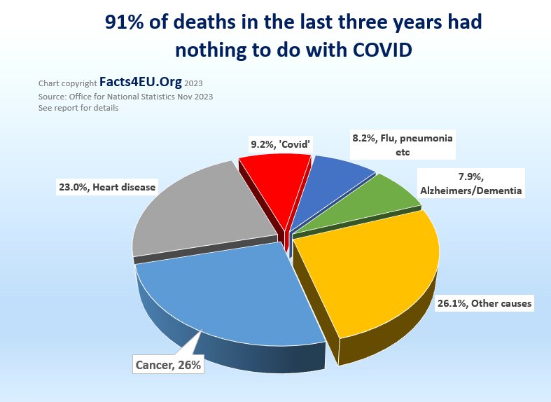 Even if one believes the official statistics (and we don’t), 91% of deaths in the last three years had nothing to do with COVID.