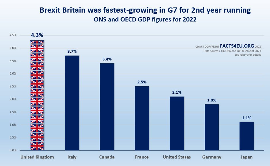 In 2021 and 2022 Brexit Britain was the fastest-growing economy in the G7, outperforming the world’s biggest, including the EU’s Germany, France and Italy. Yesterday we learnt that the UK’s economy continues to grow and that this year it has done so at a faster rate than first thought.