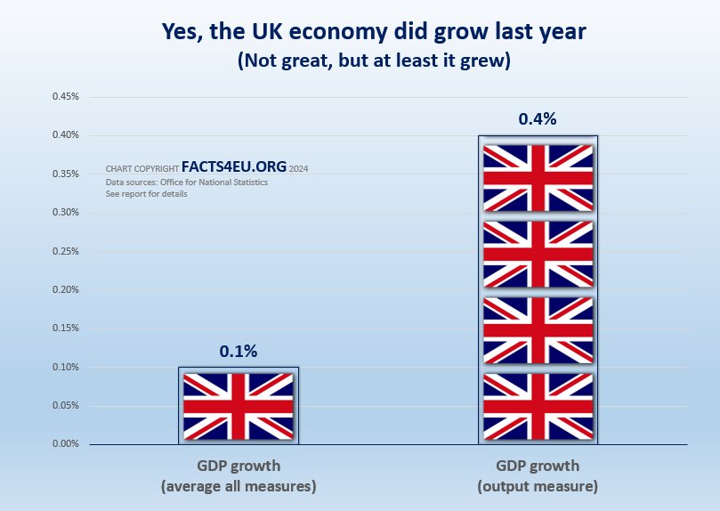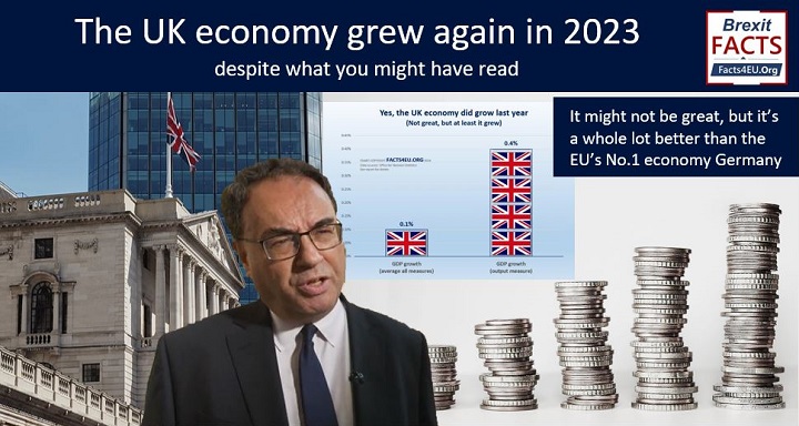 The latest GDP figures from the Office for National Statistics released on Thursday (15 Feb 2024) show a mixed picture but overall in 2023 the Brexit Britain economy grew by +0.1% on the ‘average measure’ and by +0.4% on the ‘output measure’.