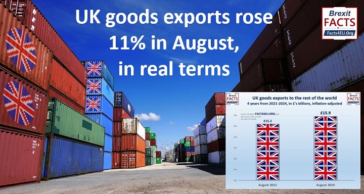UK goods exports rose 11% in August, in real terms. (Shhh – Don’t tell the BBC)