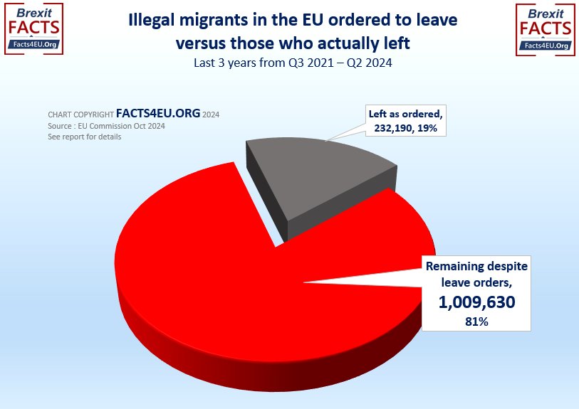 In this exclusive report the Facts4EU.Org think-tank can reveal that over 1.2 million illegal migrants have been ordered to leave the EU in the last three years (Q3 2021 – Q2 2024). We further show that more than one million of these migrants failed to obey the orders and are still in the EU – excluding those who have made it across the Channel to the UK.