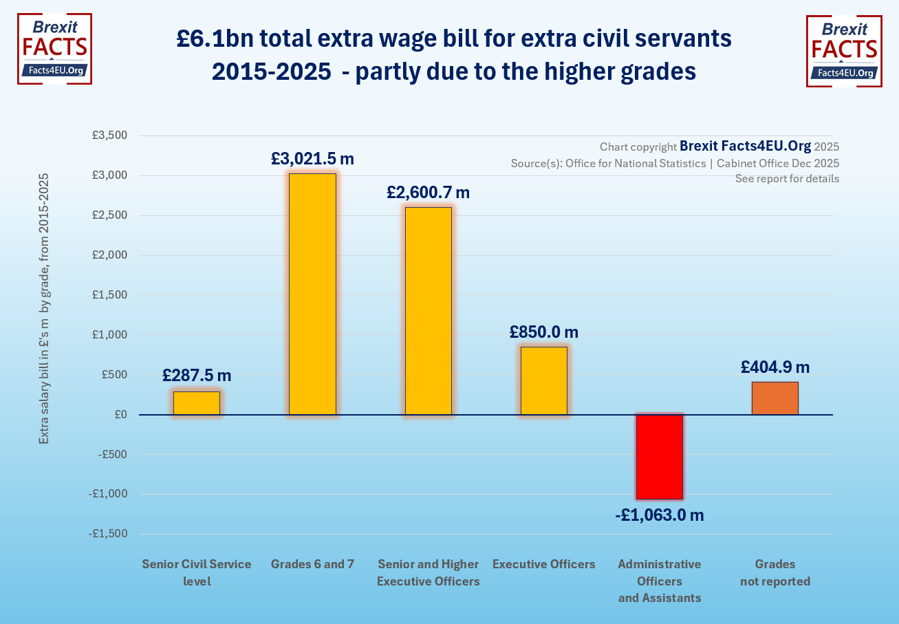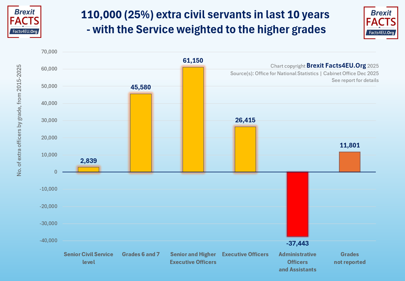 Interestingly, this puts to the sword the claim that the reason the Civil Service has had to increase in size by 25.1% in the last 10 years is because of Brexit. If that were true, then there would be a need for an increased number of Administrative Officers and Assistants. The opposite has happened and there is now a greater proportion of the higher grades and a reduced share of the lower grades.