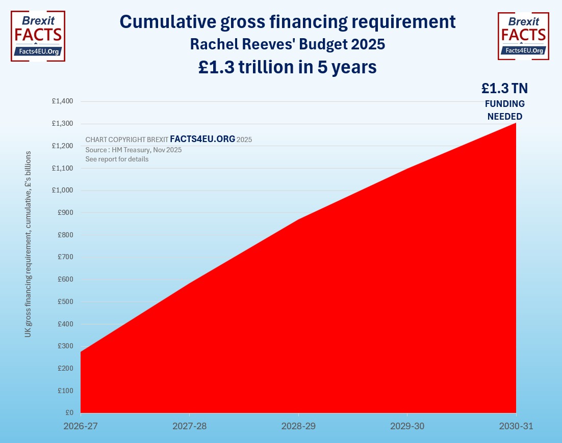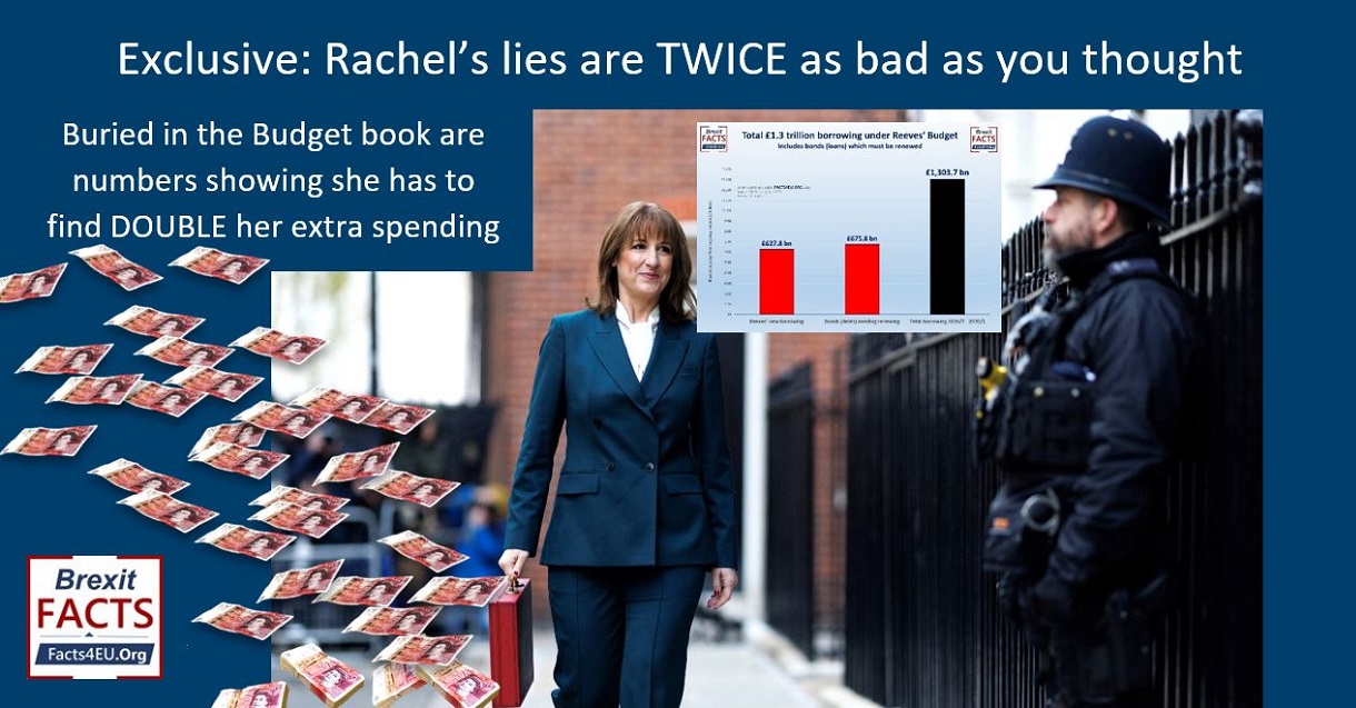 “Her Budget does no such thing. She as good as lied about her infamous ‘black hole’. On top of that, this exposé today from Facts4EU reveals the Budget will have her going to the markets to raise £1.3 TRILLION pounds. Around half of this is additional borrowing and half is needed to replace loans (bonds) coming to maturity. Now that’s something she kept very quiet about.