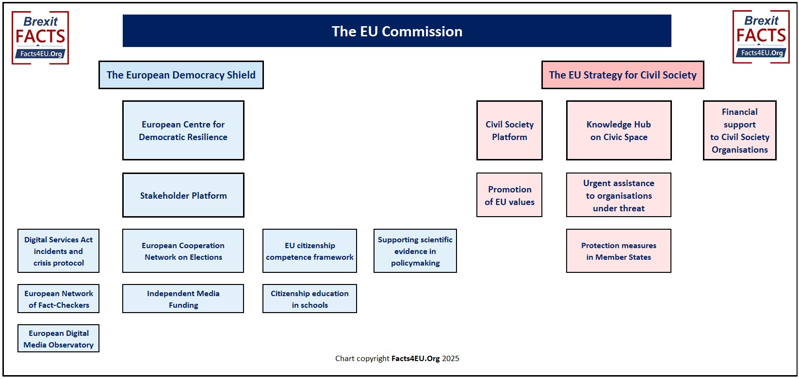 The term ‘European Democracy Shield’ embraces one major element: the ‘European Centre for Democratic Resilience ‘, under which is another body called the ‘Stakeholder Platform’, which in turn has a sub-stratum of three main components beneath it which contain various other new and existing bodies.
