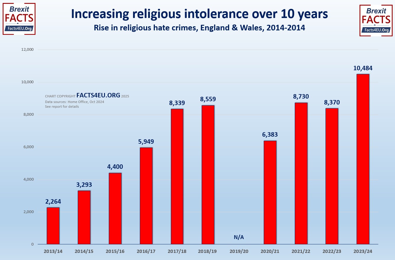 Below we present the figures for religious hate crimes for the last 10 years. Numbers have risen nearly five-fold.