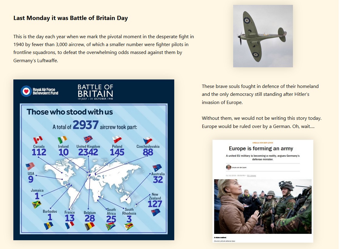 - Contrasting the UK’s commemoration of the Battle of Britain, a real fight for democracy, with the EU’s virtue signalling for an ‘International Day’