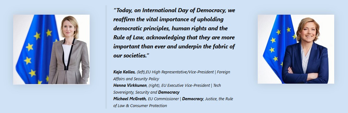 Despite this, the EU continues to maintain – and maintained again on 15 September – that “we reaffirm the vital importance of upholding democratic principles”, adding that “they are more important than ever and underpin the fabric of our societies.” (Joint statement, EU High Representative Kallas, EU Executive Vice-President Virkkunen and EU Commissioner McGrath.)