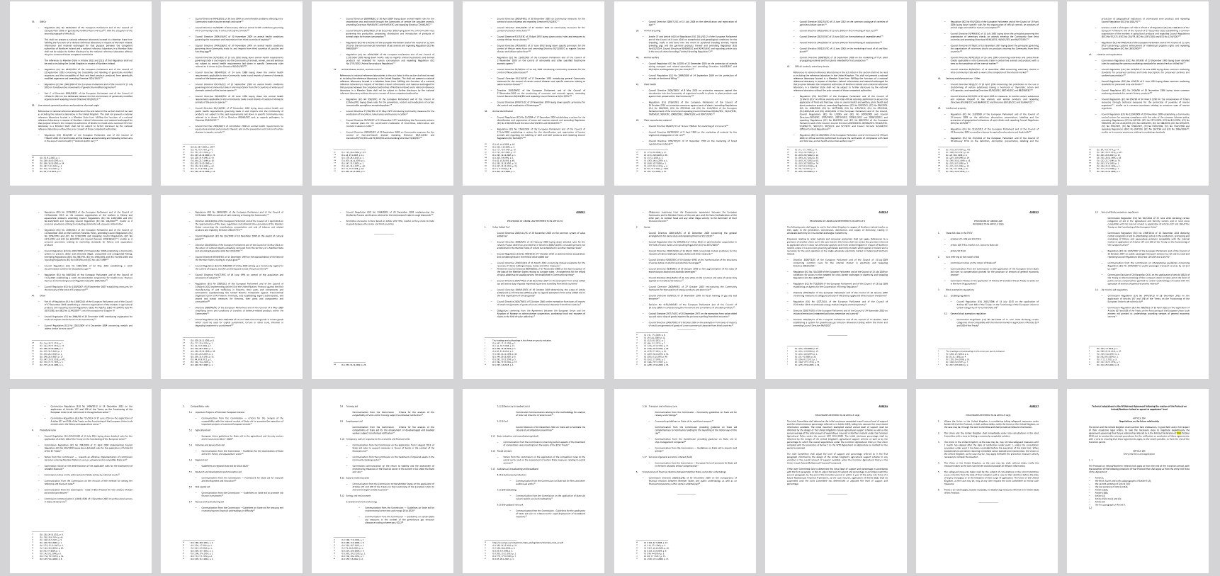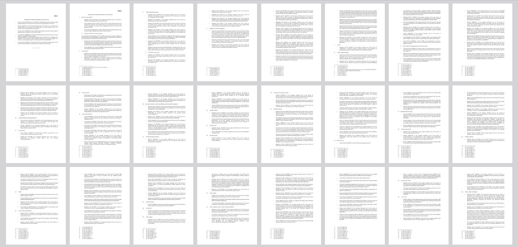 Below we show the legal annexes which affect nearly two million British people. Each thumbnail below is one page of A4, and there are 48 pages of them in total. It is important to note that each of these 48 pages only contain references – akin to headings – to EU laws, Directives, Regulations and Rules, with around 8 per page on average.