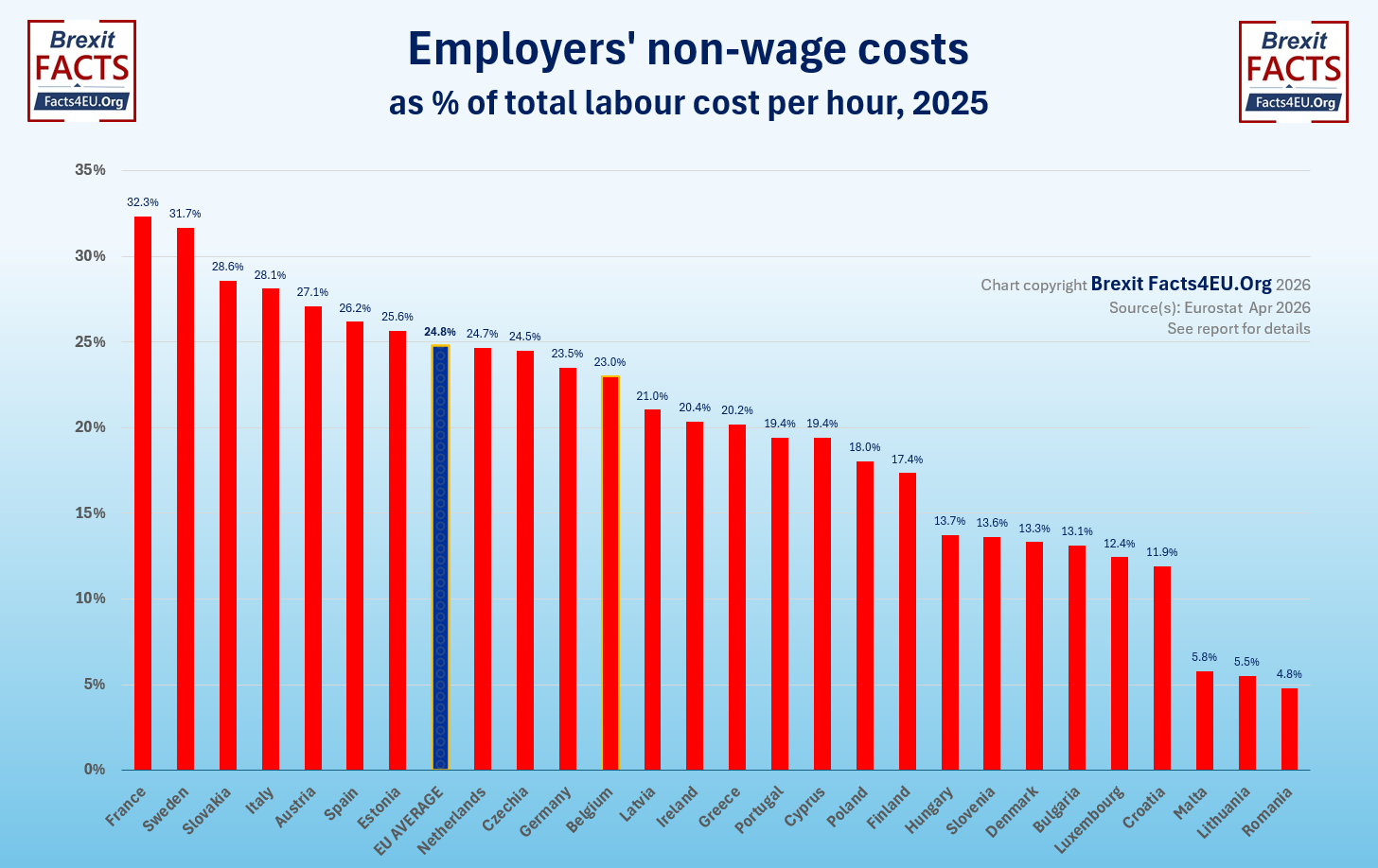 Eurostat measure these costs as a percentage of the total labour costs, so this is what we have shown. In all these charts we have excluded countries where their figure is either unavailable or is under investigation for errors. In this case this excludes Belgium and Malta.