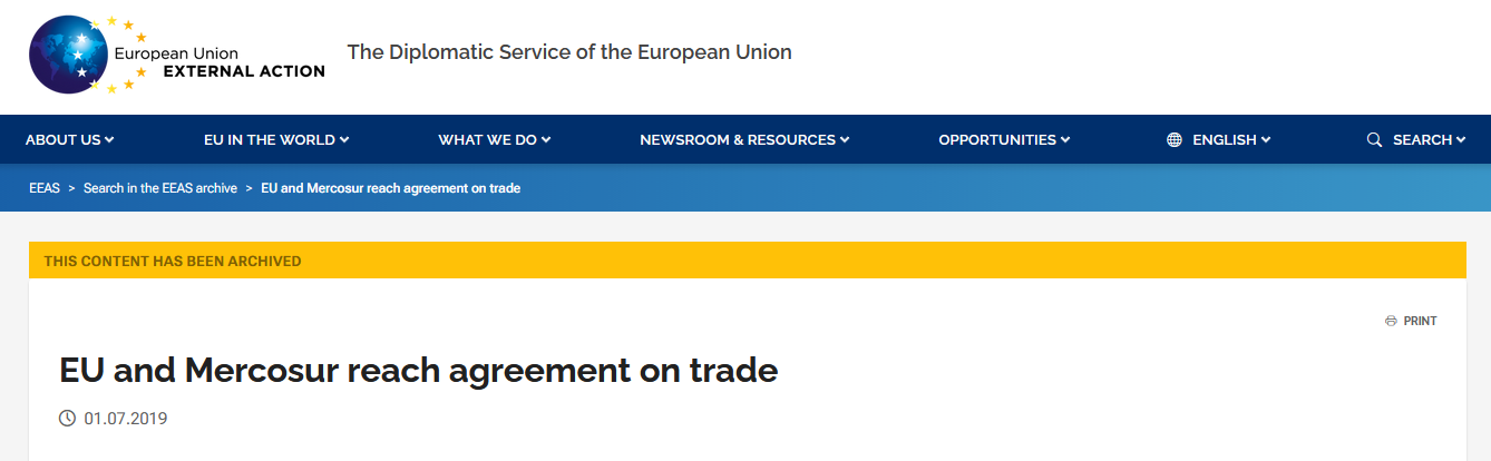 “On 28 June 2019, the European Union and Mercosur reached a political agreement for an ambitious, balanced and comprehensive trade agreement covering issues such as tariffs; rules of origin; technical barriers to trade; sanitary and phytosanitary measures; services; government procurement; intellectual property; sustainable development, and; small- and medium-sized enterprises.”