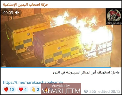The second video on the Telegram channel of “The Islamic Movement of the Companions of the Right” contains footage of the destruction of four ambulances which belonged to “Hatzola Northwest,” an emergency medical service based in London, near the Machzike Hadath synagogue in London’s Golders Green suburb.