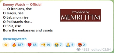 The channel urged supporters in Iran, Iraq, Lebanon, Pakistan, and across Shi'ite communities worldwide to "rise" and "burn the embassies and assets" of perceived enemies. This channel regularly shares content in English related to IRGC operations, border surveillance, regional conflicts, and anti-Western sentiment.