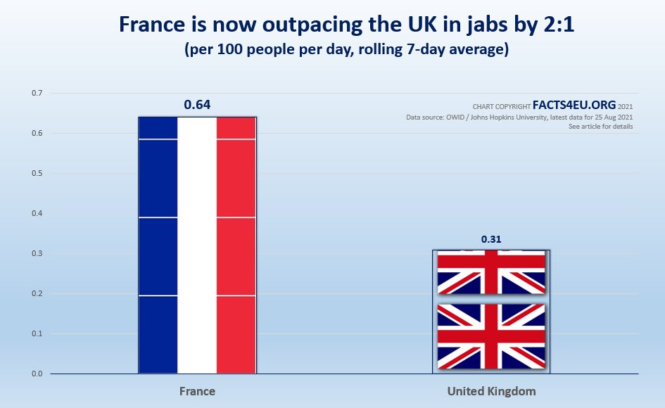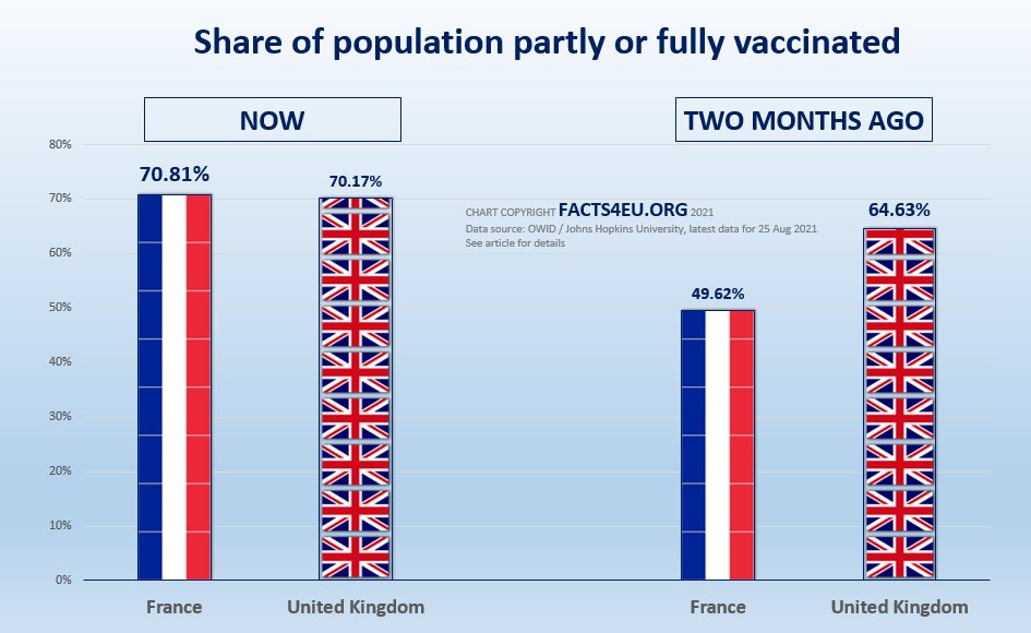 There are many ways of judging the relative performance of countries in their vaccination programmes. In some of these ways, the United Kingdom still leads France. For example, the share of the population that has been fully vaccinated (both doses) is currently 61.9% in the UK, compared to 57.2% in France.