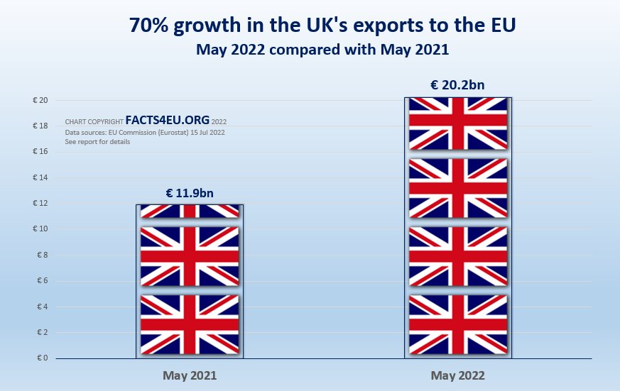• In May alone, UK exports to EU were up by 69.9% compared with May 2021
