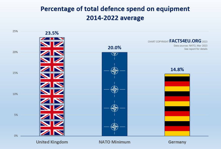 In the defence industry it takes years for investment in military hardware to translate into equipment of use in fighting a potential enemy. NATO’s secondary target is to spend at least 20% of the defence budget on equipment. The UK has consistently met this target whilst Germany’s performance has been decidedly ‘sub-optimal’.