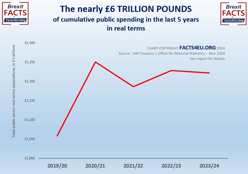 The public sector is now spending over £1.2 TRLLION pounds per year of our money. In the last five years to March this year (2024) the public sector has spent over £5.9 TRILLION in real terms. Some of this is earned by the country through the hard work of its people and the rest of it is borrowed by our country’s Government on our behalf. The latter adds to the UK’s rapidly-expanding debt, which in turn has to be financed by higher debt interest payments.