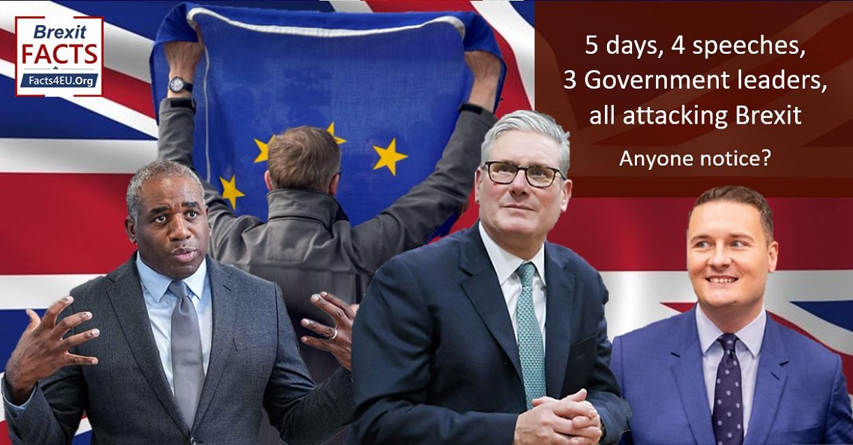 Three senior members of the government – PM Sir Keir Starmer, Deputy PM David Lammy, and Health Secretary Wes Streeting – all made speeches last week claiming it was clear the UK doesn’t work outside the EU. As it was a Manifesto promise to accept Brexit, the PM didn’t actually say anything about rejoining the EU, its Customs Union or Single Market.