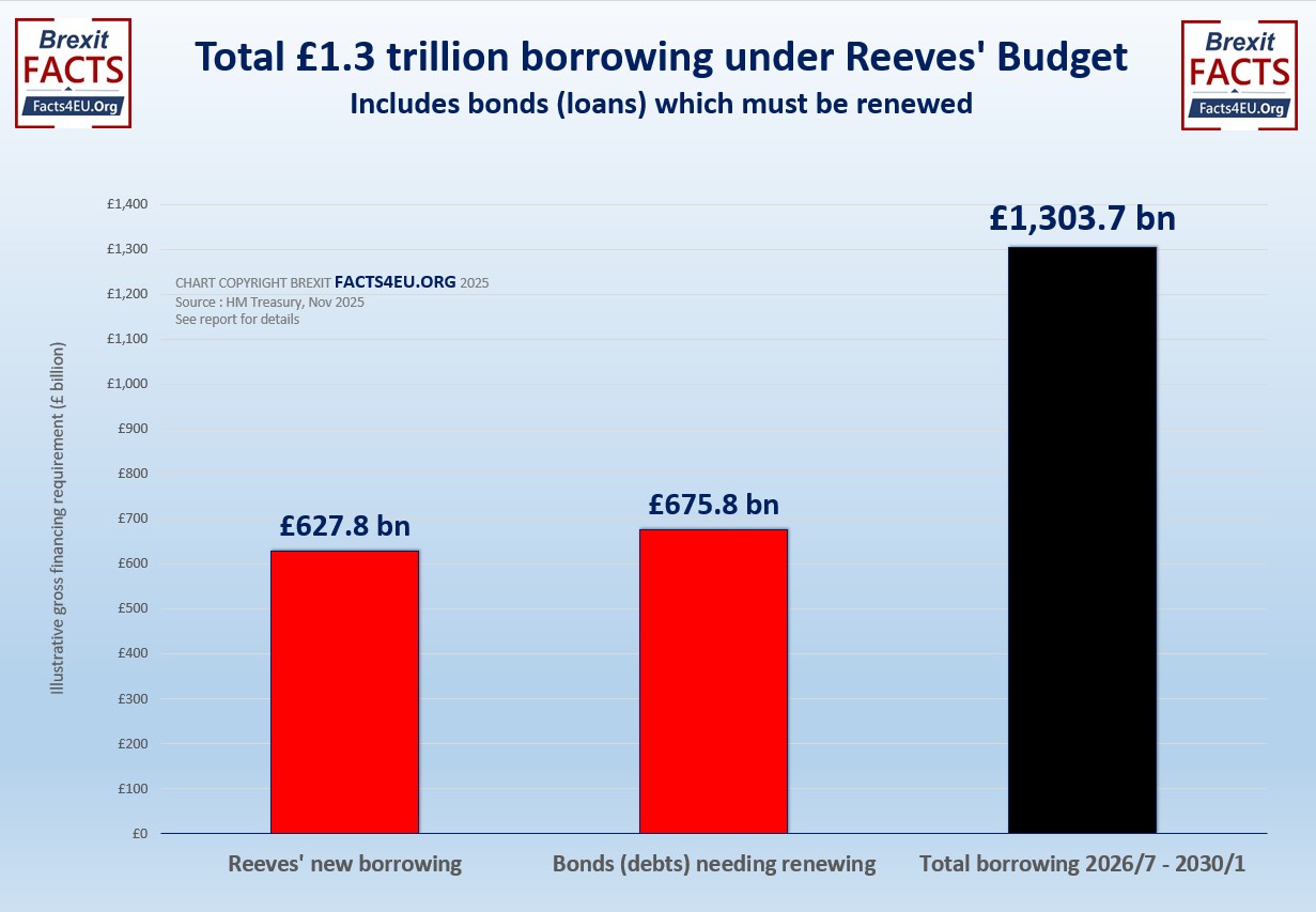 “Her Budget does no such thing. She as good as lied about her infamous ‘black hole’. On top of that, this exposé today from Facts4EU reveals the Budget will have her going to the markets to raise £1.3 TRILLION pounds. Around half of this is additional borrowing and half is needed to replace loans (bonds) coming to maturity. Now that’s something she kept very quiet about.