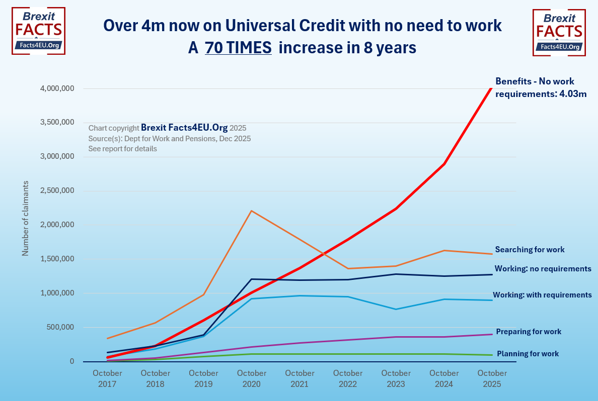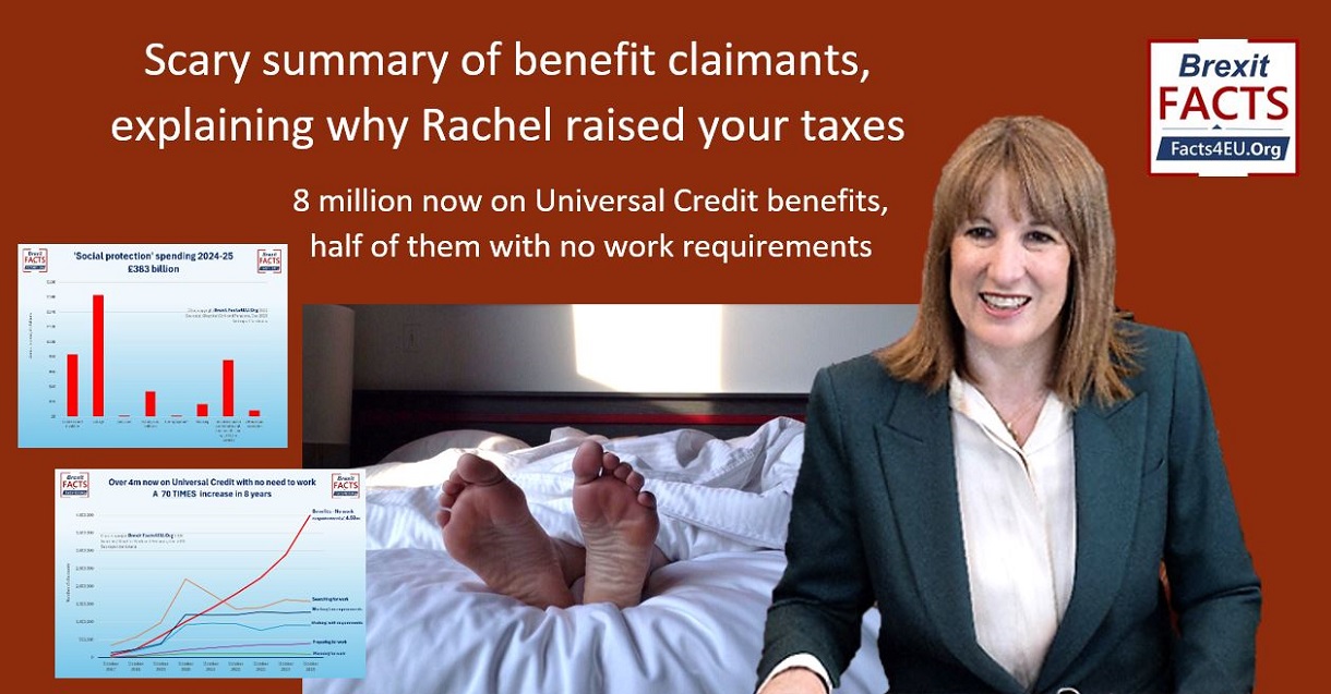 This report by the Facts4EU think-tank analyses the extraordinarily rapid growth in the millions of people on benefits in the United Kingdom. It follows our report on public spending for GB News in the aftermath of Rachel Reeves’ further increases in tax in her second Budget on 26 November 2025.