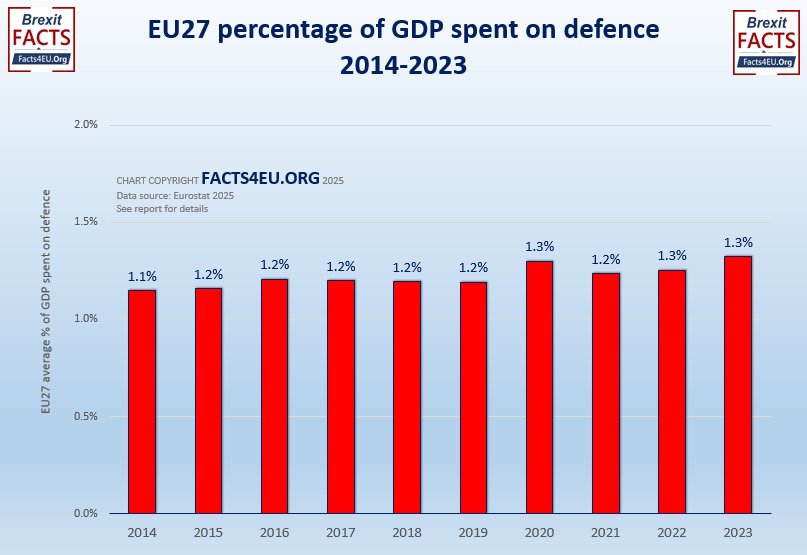 Brexit Facts4EU has always argued for 3.5%, but of course this was in relation to the UK, which has no shortfall to make up. As we have shown many times, the UK has consistently spent more than the NATO minimum and so any increase will be adding to an existing expenditure above the minimum. This may not have been enough in our view, but it was certainly a great deal better than the EU’s.