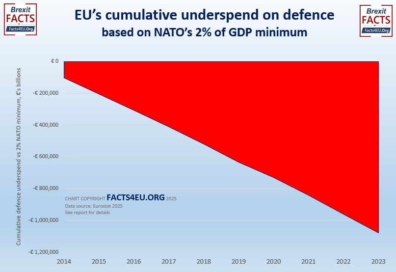 The EU27’s €1 TRILLION underspend on defence, compared to NATO’s 2% of GDP minimum, 10 years, 2014-2023