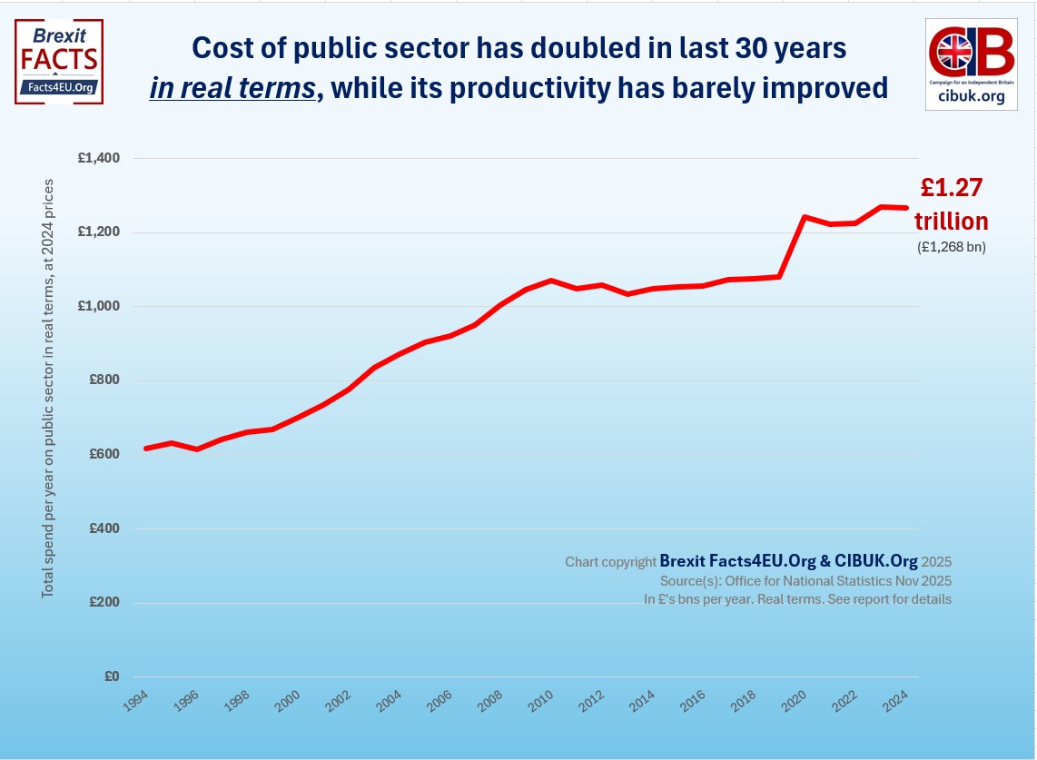 So if you live in an average household, the public sector is costing you “around £45,000 per year”. Despite this seemingly enormous amount per household, representing a total of approximately £1.28 trillion pounds this year, we have yet to hear Ms Reeves talking about where major savings can be made. (Our figures from the ONS indicate £1.27 trillion, marginally less.)
