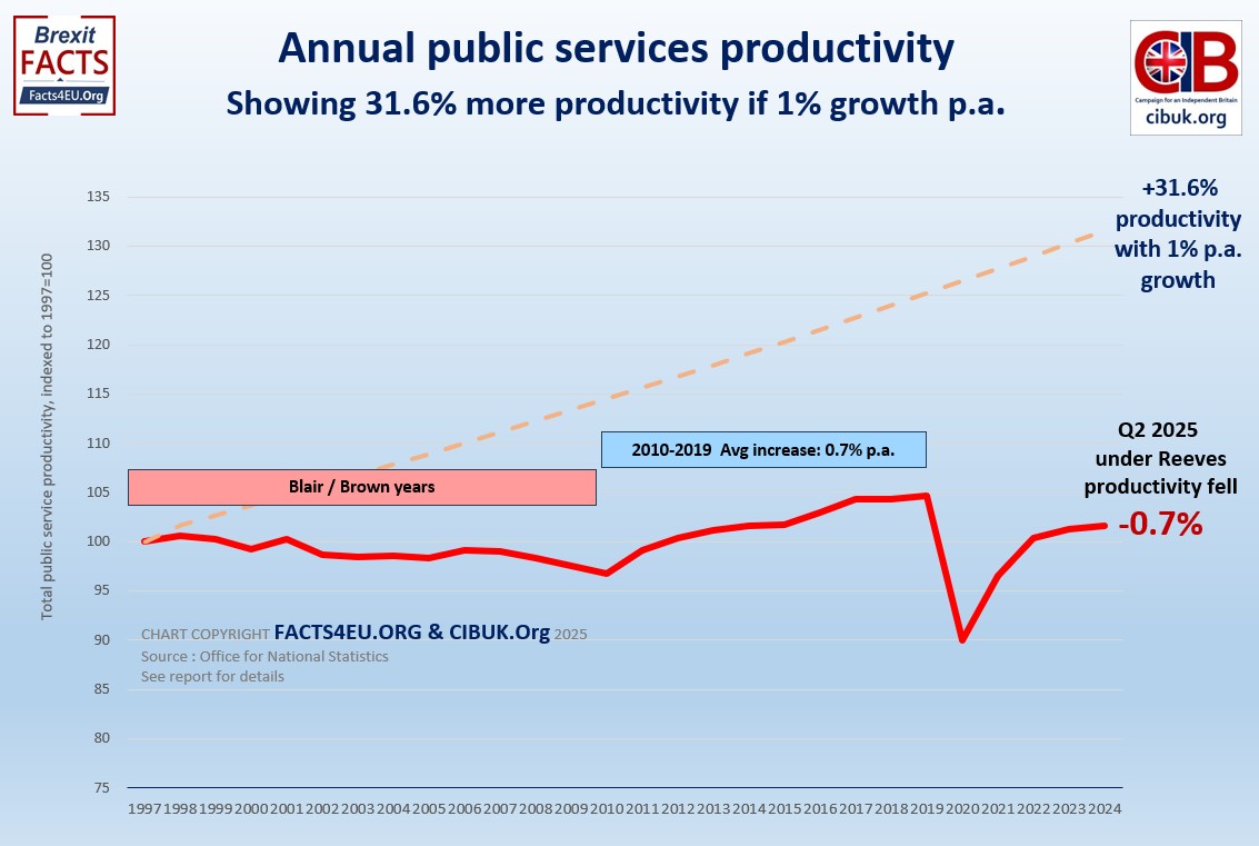 “As the graph shows, productivity fell under Labour 1997-2010 as they spent more and hired more staff. It rose a bit under the Conservatives 2010-19, as they tried to get some better value out of the public sector. It fell disastrously over Covid lockdowns and still has not properly recovered despite heavy spending on remote working, online meetings, better data handling and now AI.