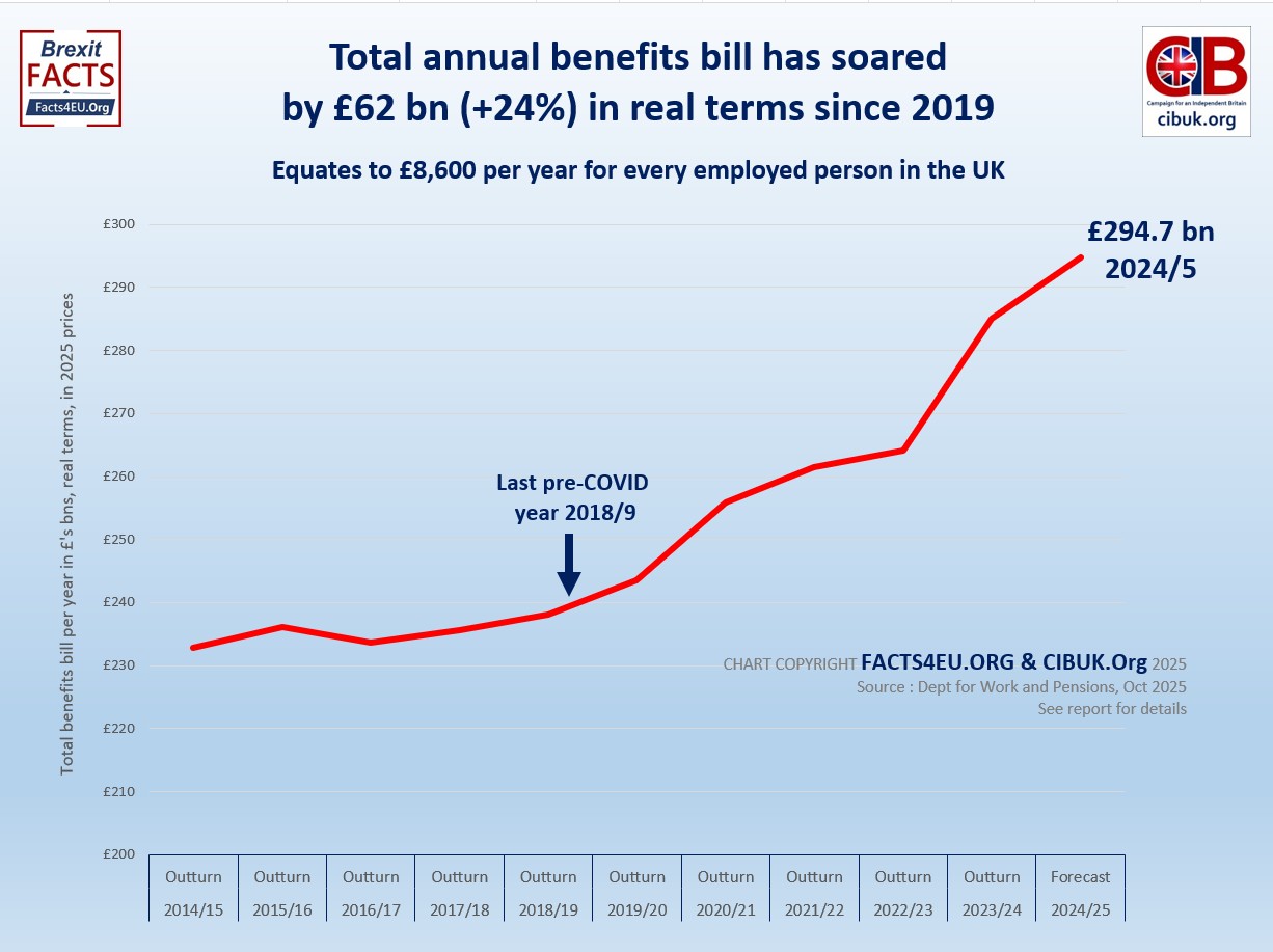 The benefits bill for the financial year 2024/5 (£294.7bn) equates to more than £8,600 per person employed in the UK.