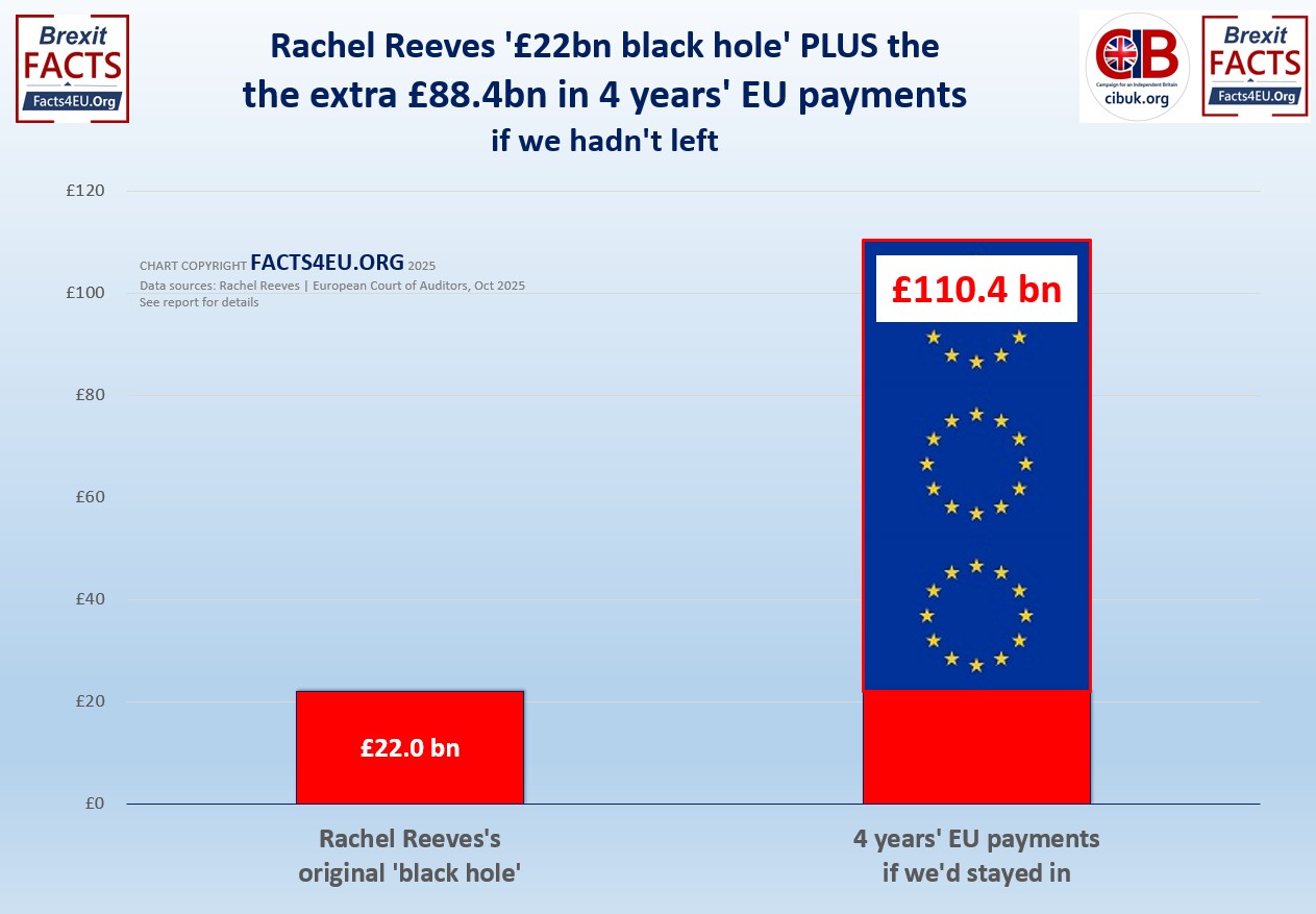“Brilliant analysis by Fact4EU reveals the huge bills the UK would be paying the EU if we had stayed in. The Rachel Reeves black hole would be five times her estimate. UK taxes would have to rise in a frightening way. We would be lashed to a sinking ship.