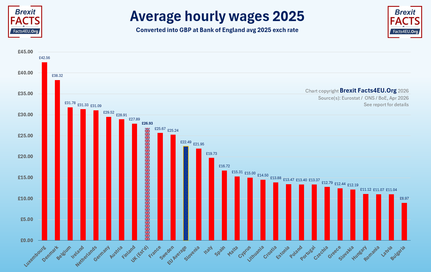 [Sources: Eurostat | ONS – figures accessed 07 Apr 2026. Euros converted into pounds at Bank of England average exchange rate for 2025. Note: UK figure estimated as ONS have not yet published this. Calculated using average wage growth for 2025 and applying to 2024 figure.]