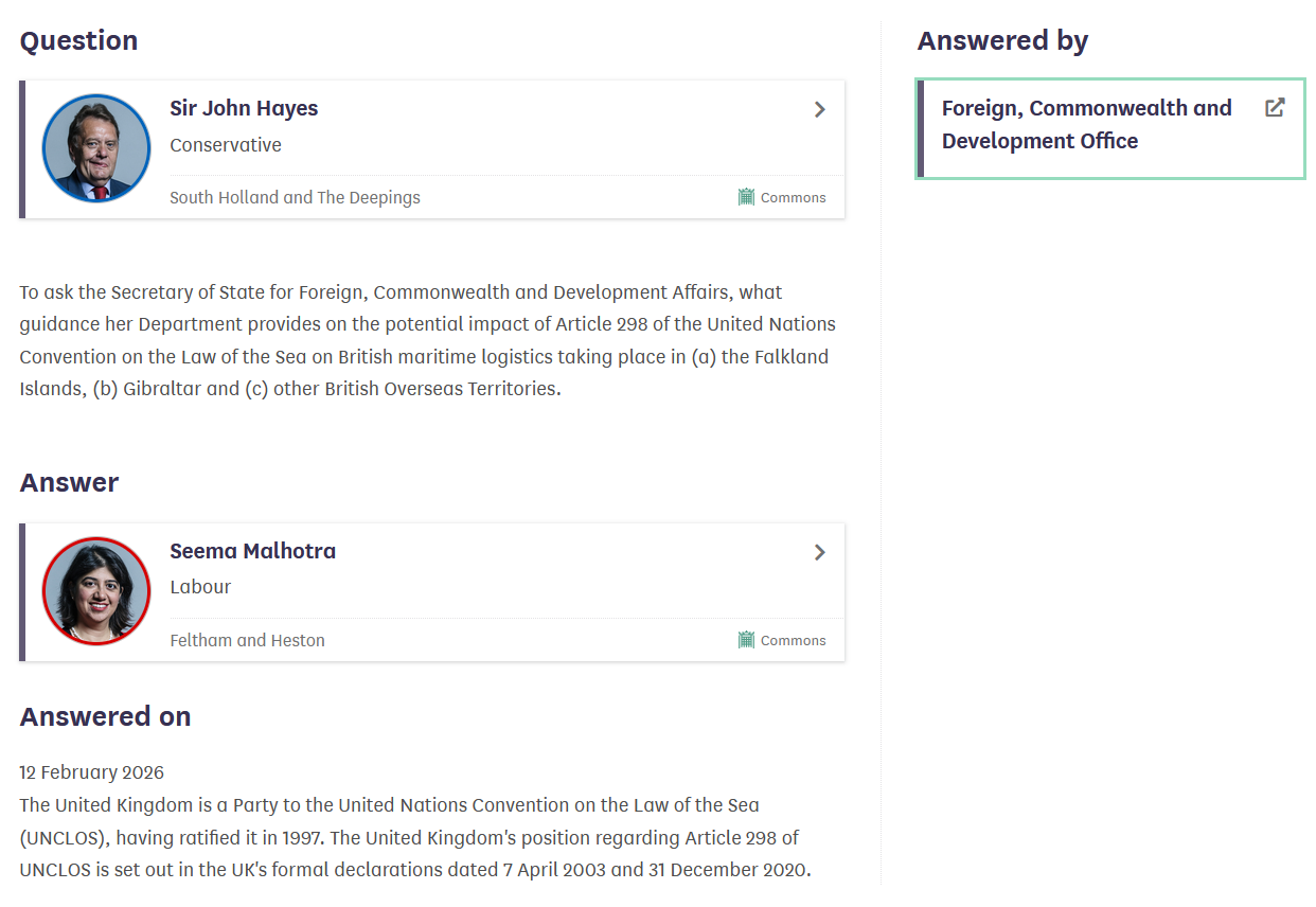 [ Sources: House of Commons Hansard | UNCLOS Treaty | ICJ | ITU | Our legal advisors] Politicians and journalists can contact us for details, as ever.